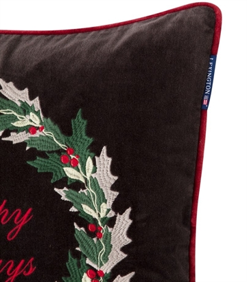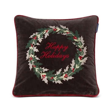 Nostalgisk, klassisk og helt fantastisk er det nye pudebetræk fra Lexington med gran og kristtjørn. Pudebetrækket har en elegant krans med kristtjørn og "Happy Holidays" -tekst på en varm mørkegrå baggrund understreget af med røde kantbånd. Lynlåsen i bunden og Logolabel.