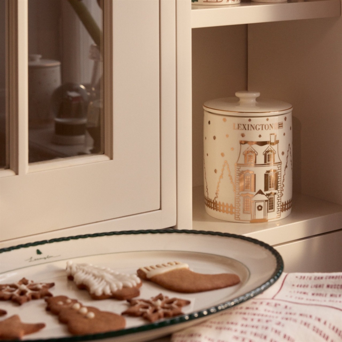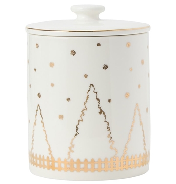 Skøn og glamourøs stentøjskagekrukke med låg i eksklusivt "Winterhouse"-design med blank glasurfinish.