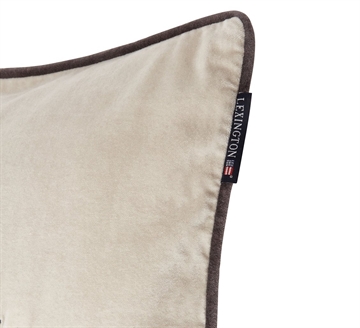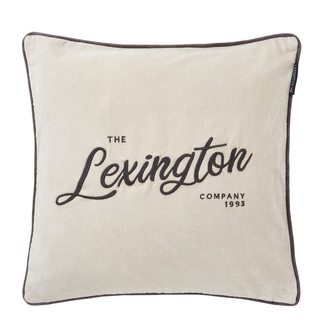 Lækker, klassisk og dekorativt velourpudebetræk fra Lexington i beige med mørkegrå skrift og kantbånd.