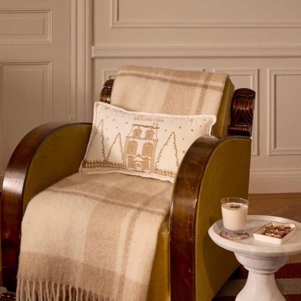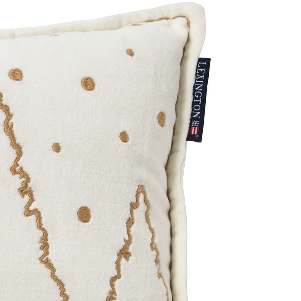 Skøn og klassisk julepude i elegant design med broderet Winterhouse hvide og beige farver på forsiden. Puden er lavet i en virkelig indbydende blød, økologisk bomuldsvelour med kraftige syninger rundt i kanten og vævet Lexington logo-mærkat i øverste højre hjørne. Elegant og klassisk Lexington Holiday.